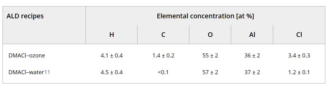 表1 DMACl -臭氧和DMACl -水ALD中大部分Al2O3薄膜中元素濃度的比較。在200℃下沉積400個ALD循環。