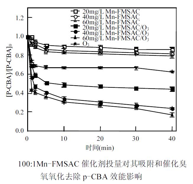 2. 隨著臭氧濃度的增加,100:1Mn-FMSAC 催化臭氧氧化去除p-CBA的效率顯著增強(qiáng).綜合考慮催化效果及原材料成本,當(dāng)臭氧投加量為1mg/L 時(shí),催化劑的 很佳投加量為40mg/L.