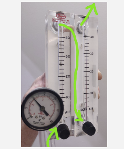 當(dāng)氣體,無(wú)論是空氣還是氧氣,通過流量計(jì)加壓時(shí),流量計(jì)將讀取不準(zhǔn)確的流量。下圖顯示了兩個(gè)相同的流量計(jì)并排,從氧氣濃縮器流過每個(gè)流量計(jì)的氧氣量相同。左邊的流量計(jì)壓力為20 psi,右邊的流量計(jì)壓力為0 psi。盡管流經(jīng)流量計(jì)的氧氣量是相同的,但流量讀數(shù)是不同的。在壓力下,流量計(jì)的讀數(shù)將低于實(shí)際流量。