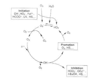 自由基反應的引發(fā)劑是能夠從臭氧分子誘導形成超氧離子O2的那些化合物。這些是無機化合物(羥基離子OH-,氫過氧化物離子HO2 - 和一些陽離子),有機化合物(乙醛酸,甲酸,腐殖質(zhì)......)和253.7 nm的紫外線輻射。