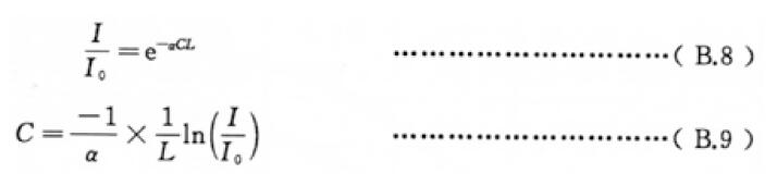 臭氧對254 nm 波長的紫外光有特征吸收。臭氧化氣樣品和參比氣體( 不含臭氧的空氣或氧氣)分別以恒定的流速進入儀器的吸收池,參比氣通過吸收池時,被光檢測器檢測的光強為I0,樣品氣通過吸收池時被檢測器檢測的光強為I 0。I / I 0 為透光率。儀器的微處理系統(tǒng)根據朗伯- 比爾定律計算出臭氧濃度,這些量之間的關系表示為式(B.8) 或式(B.9):
