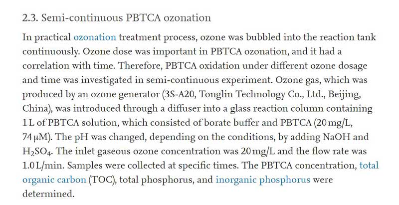 清華大學(xué)環(huán)境系使用同林臭氧發(fā)生器進行水處理實驗,撰寫了關(guān)于臭氧化降解2-膦酰丁烷-1,2,4-三羧酸(PBTCA):動力學(xué),磷轉(zhuǎn)化,抗沉淀性能變化和除磷的論文。